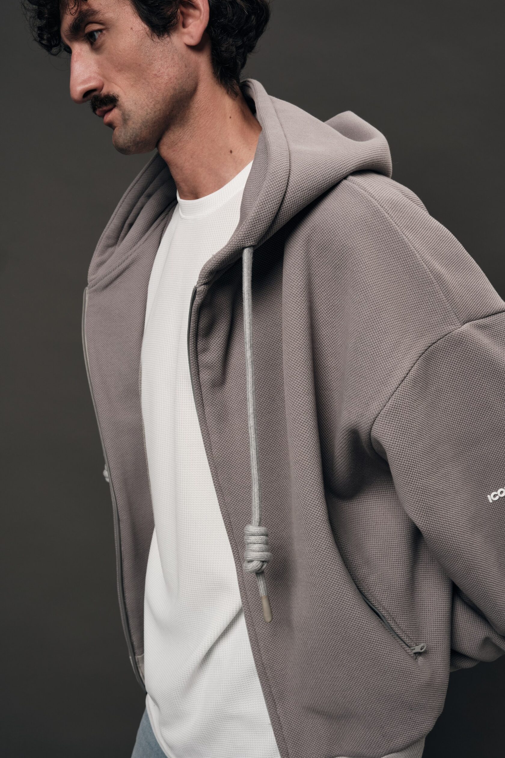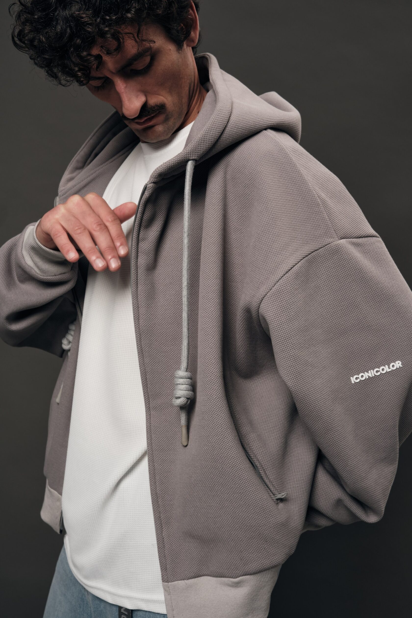 Тепло микрофлиса соединяется с выразительной фактурой пике. Контраст серого и чёрного придаёт динамику и глубину. Фактура, которая движется вместе с брендом.
