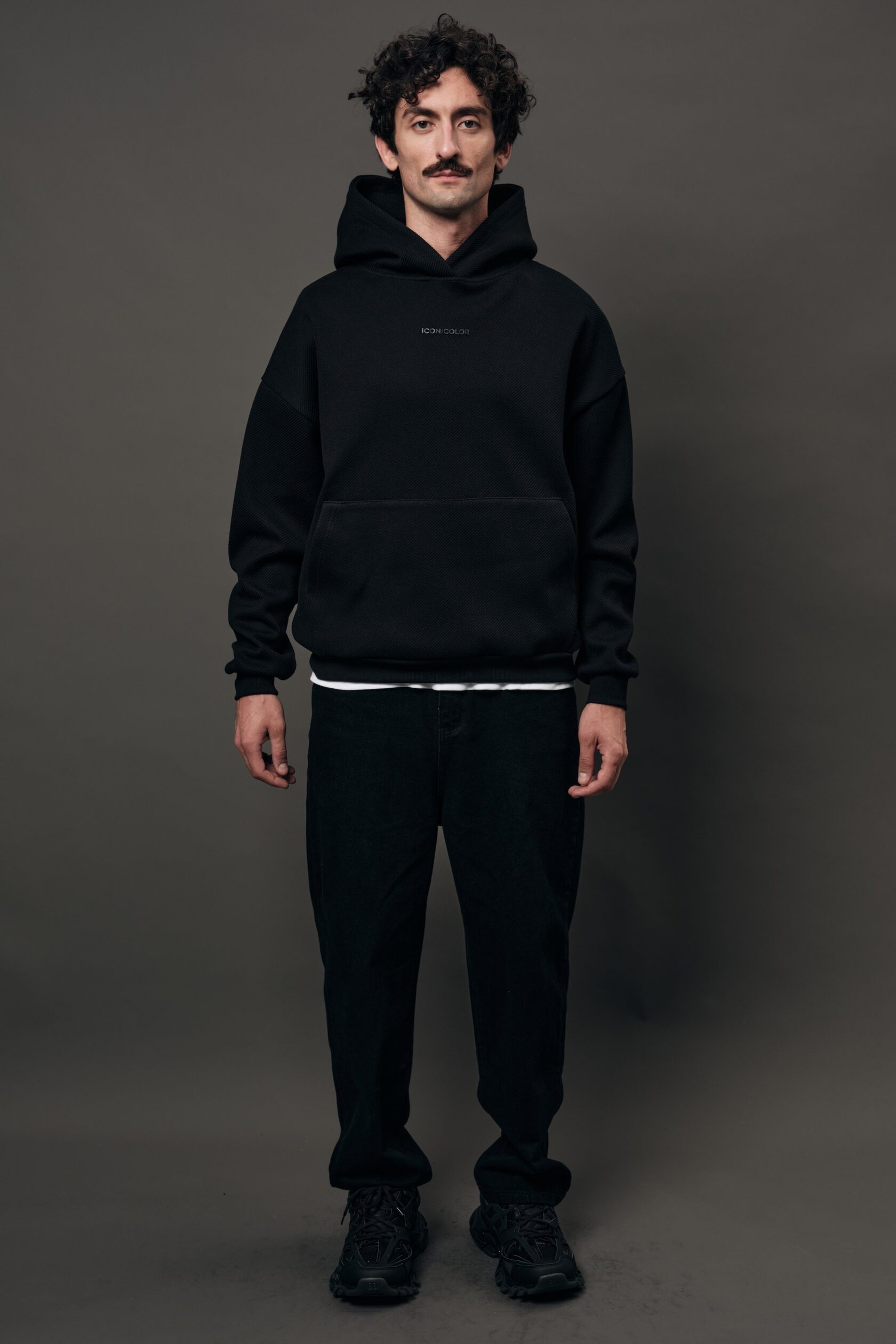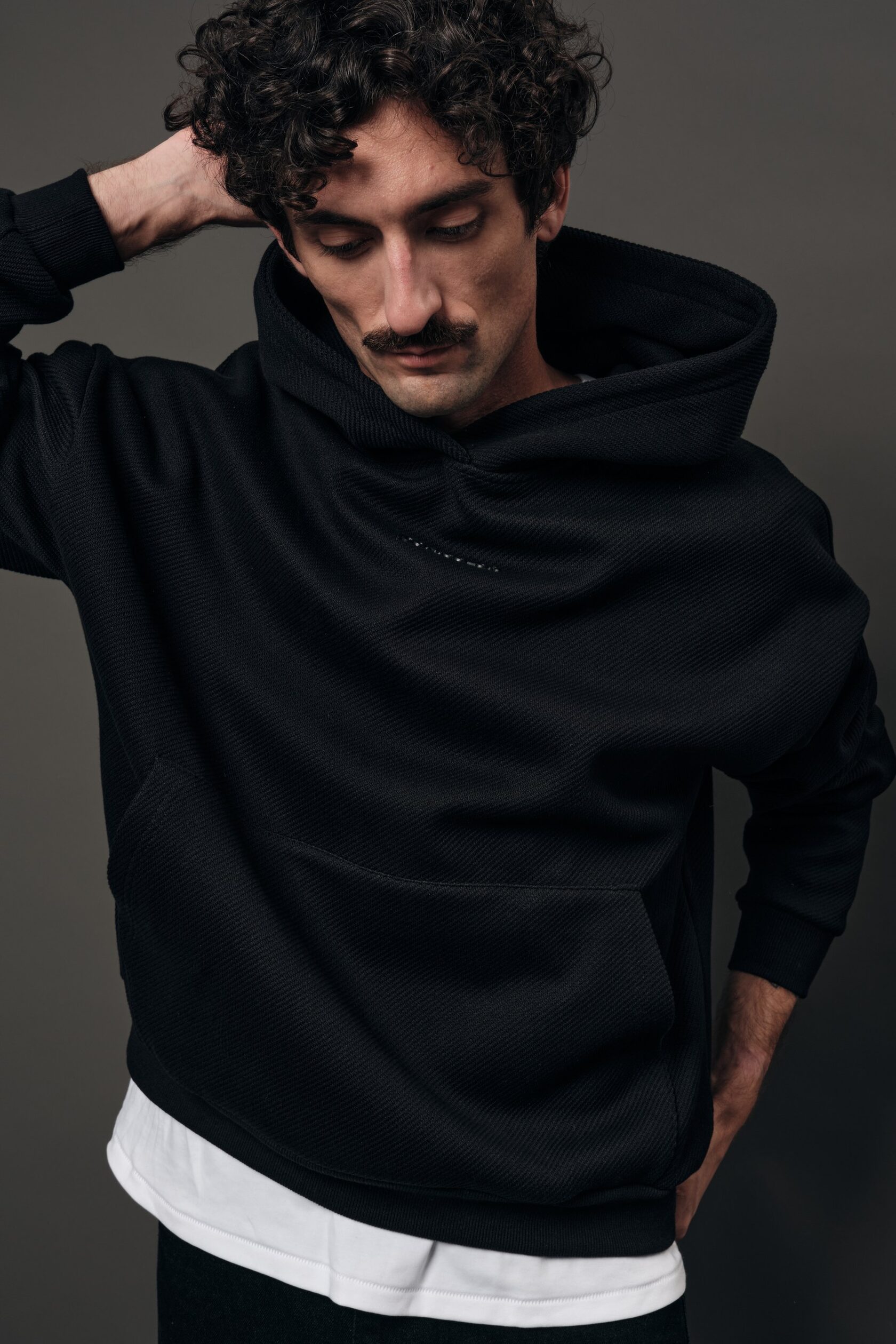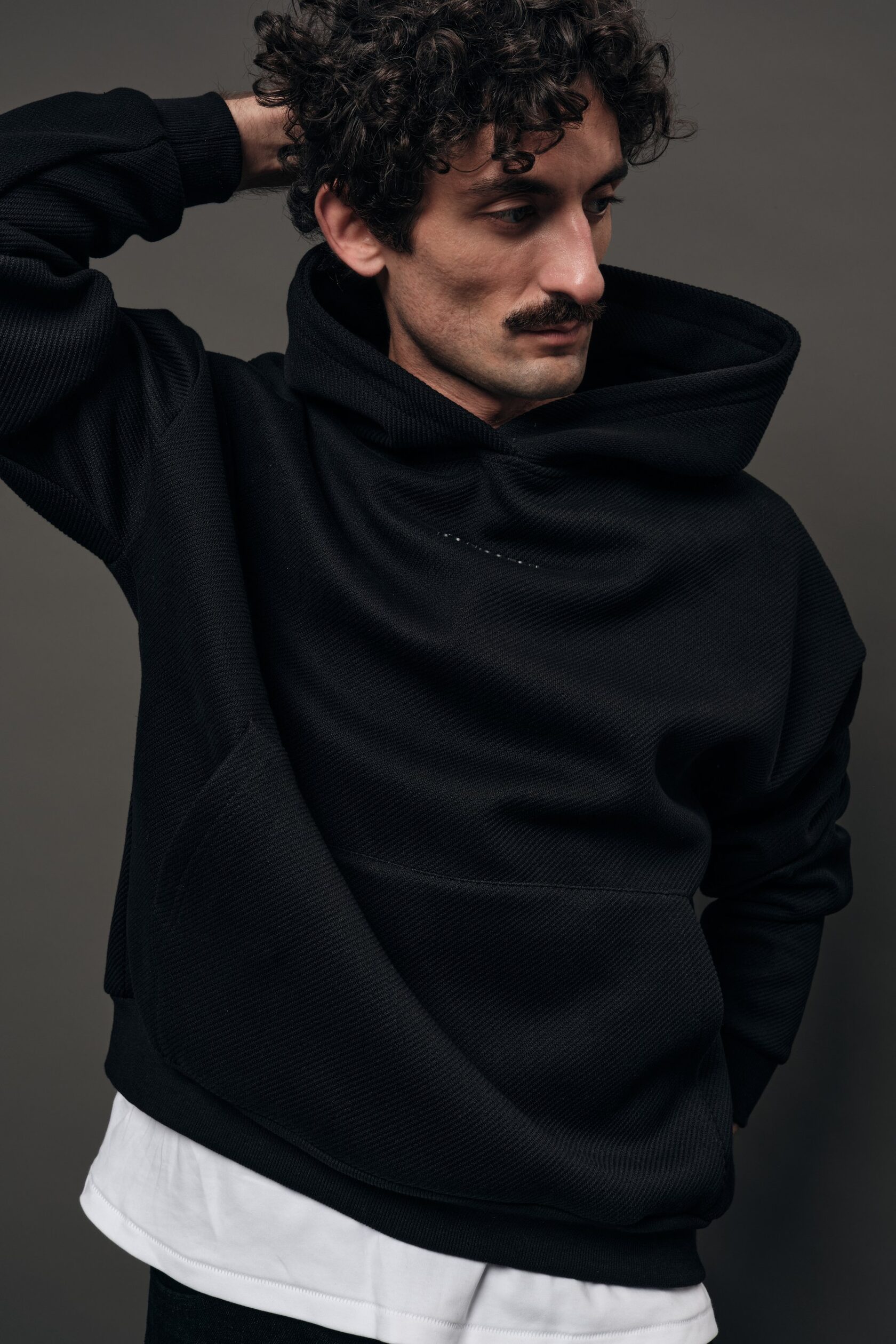 BODY / MegraTech: Нежность плюша и структурная диагональ создают прочный и лаконичный образ. В чёрном цвете ткань выглядит монументально. Сдержанность, превращённая в силу.