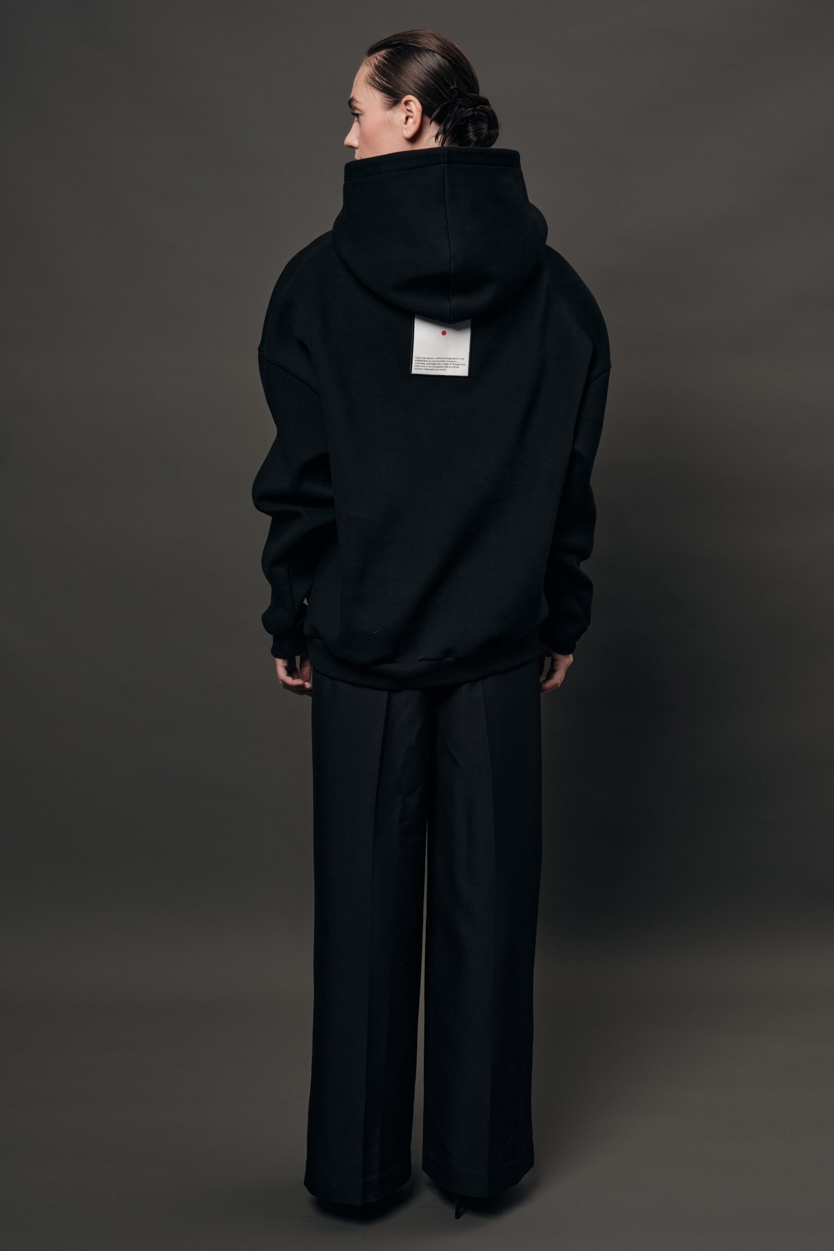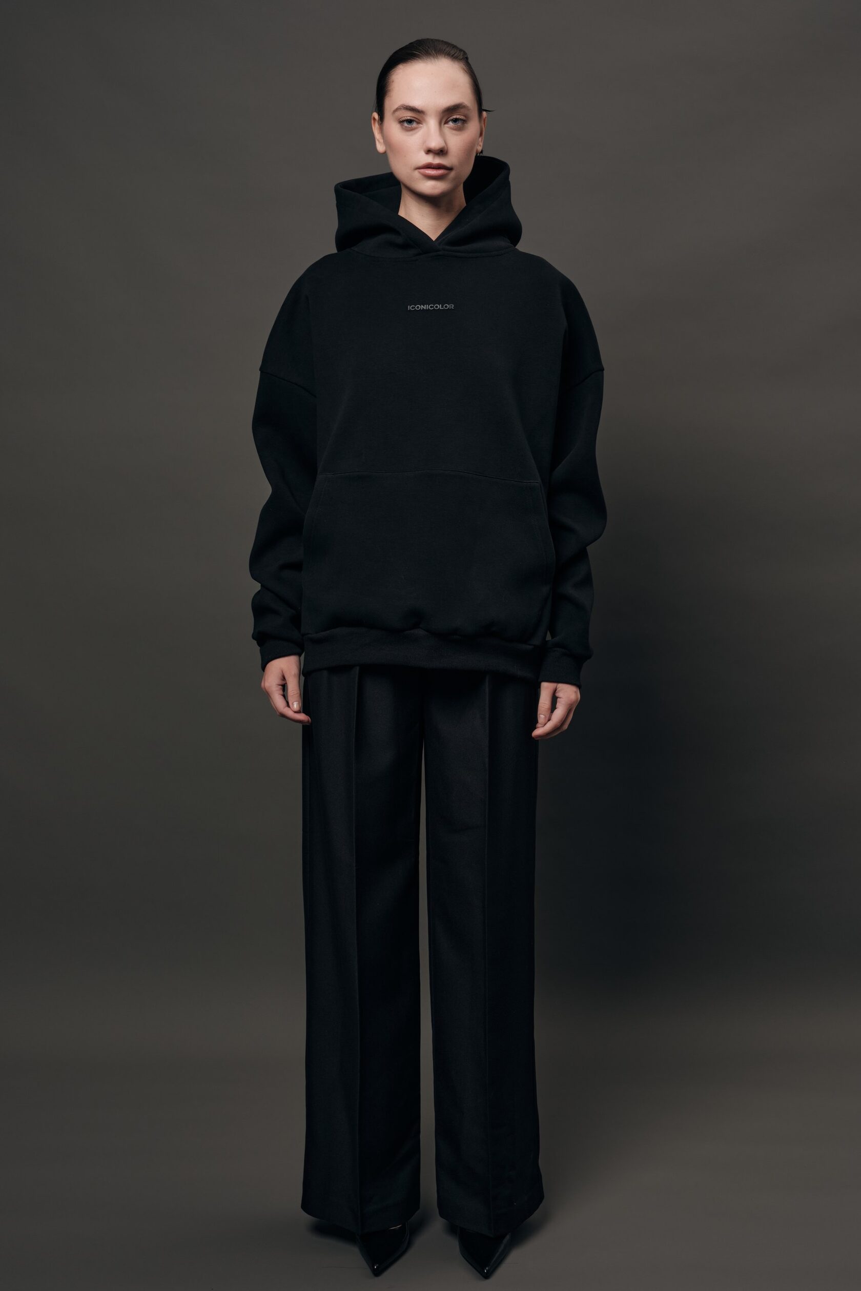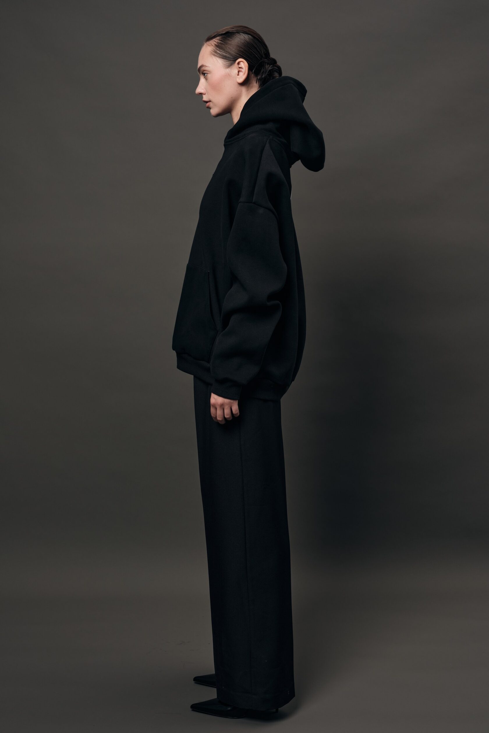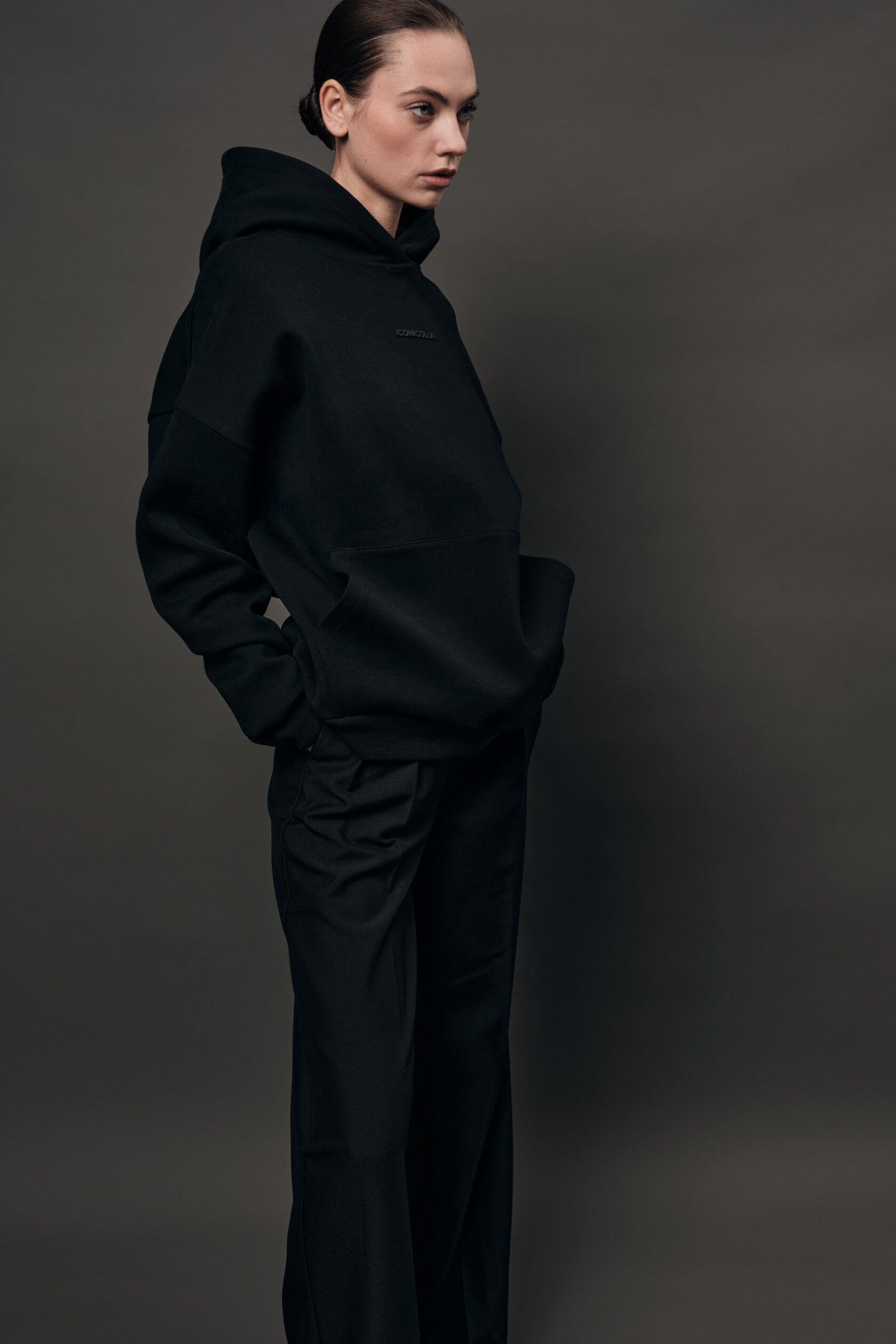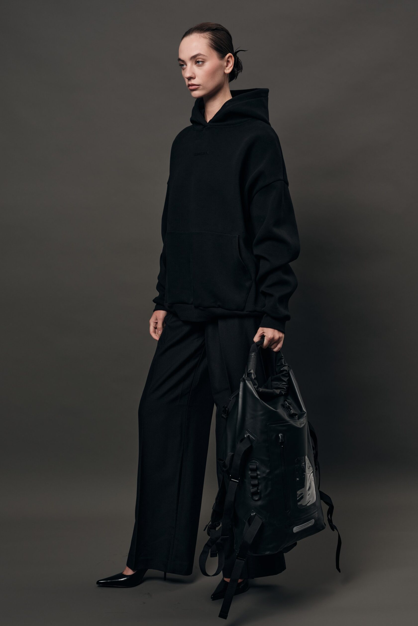 Нежность плюша и структурная диагональ создают прочный и лаконичный образ. В чёрном цвете ткань выглядит монументально. Сдержанность, превращённая в силу.